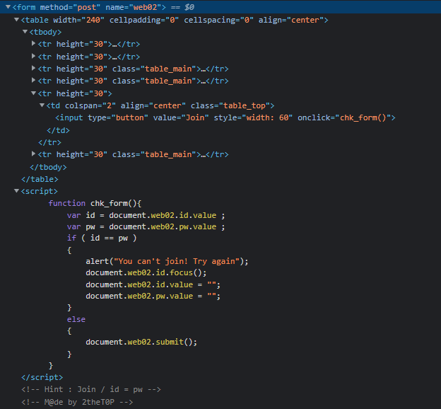 스크립트 아랫쪽의 힌트를 보아하니 id 필드와 pw 필드의 값이 같아야 Authkey를 획득 할 수 있는 듯 하다.